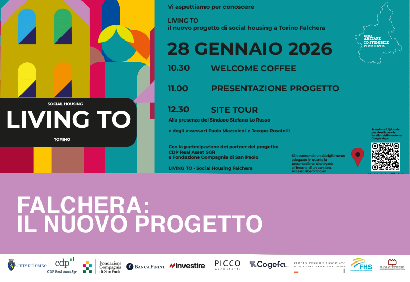 Mercoledì 28 gennaio 2026, alle ore 11.00, si terrà a Torino l’evento di presentazione del progetto di social housing Living TO Falchera, attualmente in corso di costruzione nel quartiere Falchera. L’incontro avrà luogo in Via Antonio Sant’Elia (all’altezza della rotonda al termine della strada) e sarà preceduto da un welcome coffee alle ore 10.30.